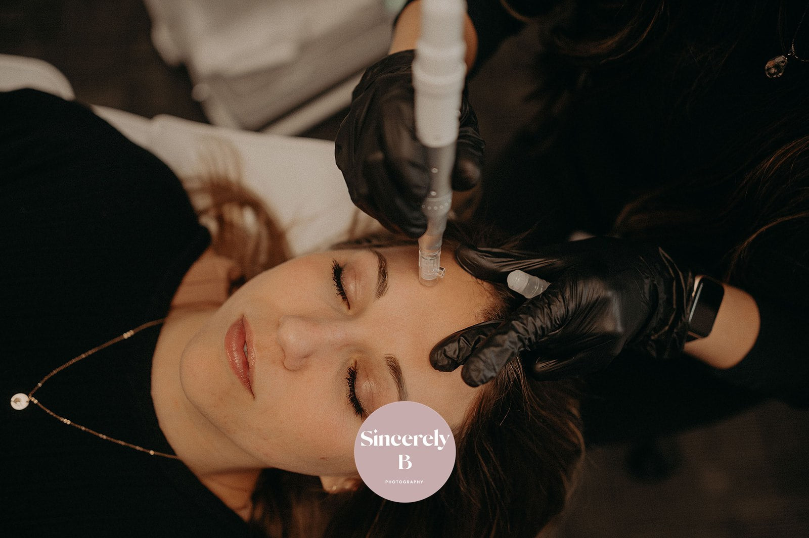 After our esthetician cleanses your face, an enzymatic exfoliation is put on your skin to prepare it for your treatment. Next, you’ll apply a topical numbing ointment to increase comfort during the treatment. Once numb, we use a powerful handpiece to create small channels in the skin, activating that natural healing process.